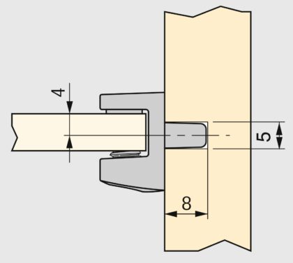 - Der Glasbodenhalter 4007907 wird in das vorgebohrte Befestigungsloch mit dem Durchmesser ⌀5 mm (13/64″) und der Tiefe vom mindestens 8 mm (5/16″) in der Korpuswand eingeschoben